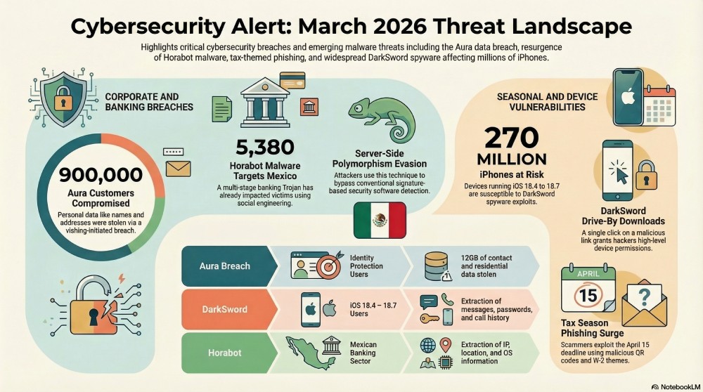 Here are some of the biggest head turners from last week’s cybersecurity landscape. While the Horabot banking malware has re-entered Mexico, the Aura data breach exposed a whopping 900,000 customers to potential threats. Meanwhile, cyber incidents are surging because of the ongoing tax season. A new malware, “DarkSword,” is giving nightmares to iPhone users across the globe.