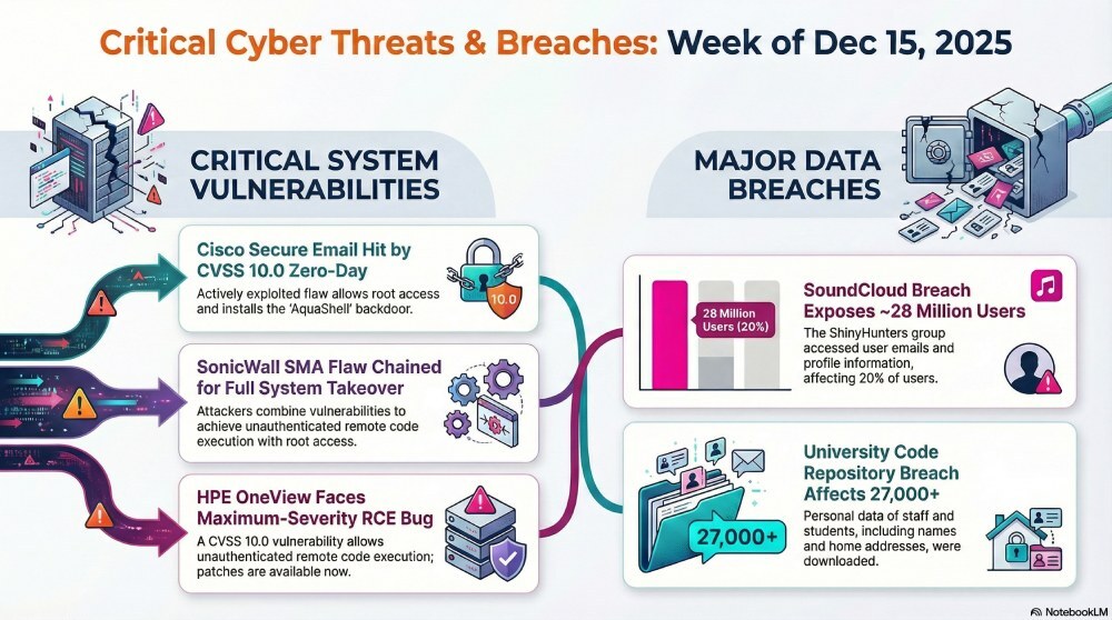 Cybersecurity and email security teams faced a busy week as active exploitation targeted core infrastructure and widely used platforms. Cisco warned of a critical AsyncOS zero-day affecting Secure Email appliances, while SonicWall patched an SMA 100 flaw reportedly chained for root-level takeover. HPE fixed a maximum-severity OneView RCE issue. SoundCloud also confirmed a breach exposing user emails and profile data, alongside outages, VPN blocks, and follow-on disruption.