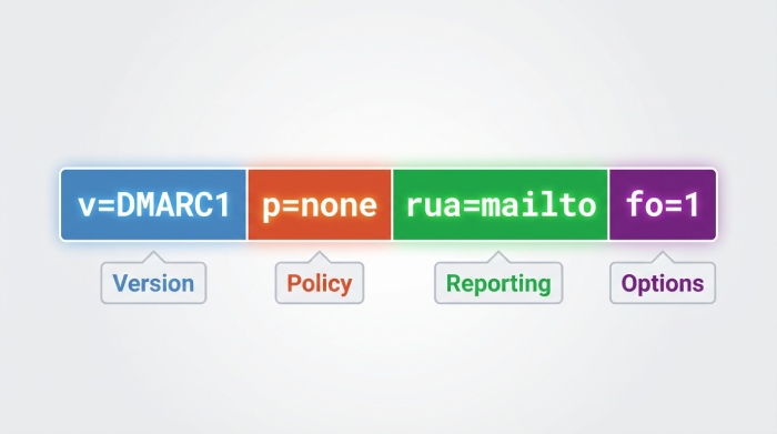 - v=DMARC1; p=none (initially for monitoring); rua=mailto:…; ruf=mailto:…; fo=1; pct=100; aspf=r; adkim=r