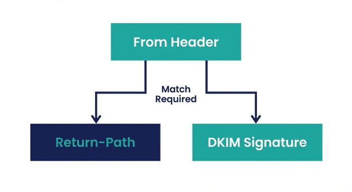 Engineer alignment explicitly: match the visible From to the Envelope-From (Return-path header) and to the DKIM signature d=. Doing so increases both SPF alignment and DKIM alignment pass rates, helping email authentication survive real-world routing. This reduces DMARC failure at Gmail, Outlook, and Yahoo and accelerates DMARC troubleshooting when exceptions appear.