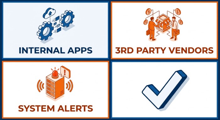 Create a complete inventory of email vendors, internal apps, and service accounts. For each stream, record: