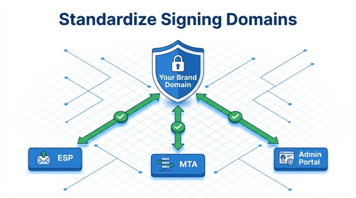 Reassert control of DKIM alignment by ensuring every sender signs with your organizational domain or an intentionally aligned subdomain. Require an organizational domain match in the DKIM signature’s d=, and remove domain misalignment introduced by third-party email providers and email vendors. In practice, that means enforcing a single, brand-owned domain across your ESP (Email Service Provider), MTA (Mail Transfer Agent), MailChimp admin portal, and SendGrid admin portal so DKIM alignment is consistent and immune to configuration drift.