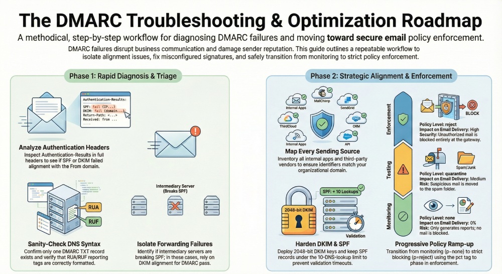 Publish 2048-bit DKIM keys on correctly named selector TXT records and prefer relaxed/relaxed canonicalization to survive benign in-transit modifications. Confirm body hash integrity with real message samples; minuscule footer injections or whitespace changes can trigger DKIM failure and downstream DMARC failure if canonicalization is too strict. Include DKIM signature verification in your routine authentication checks and DMARC troubleshooting playbooks to catch misconfigured signatures before they cause delivery pain.