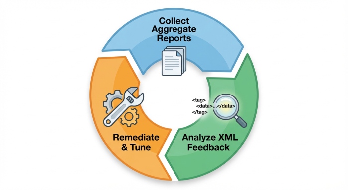• Use record parsing pipelines to standardize differing XML feedback formats, noting policy value, source IPs, domain alignment, and authentication results per source.