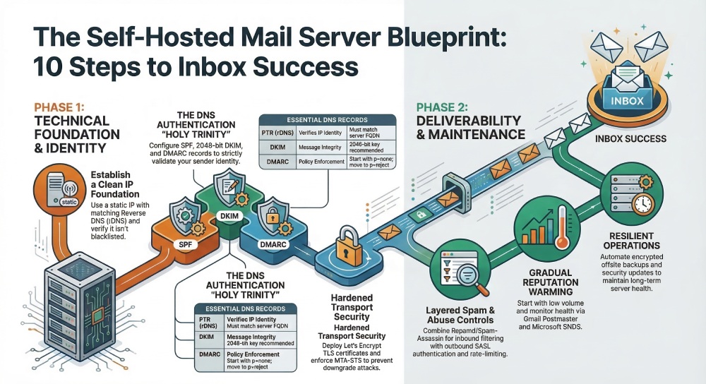 - Verify end-to-end with seed tests, blocklist checks, and postmaster tools before switching MX to your mail server.