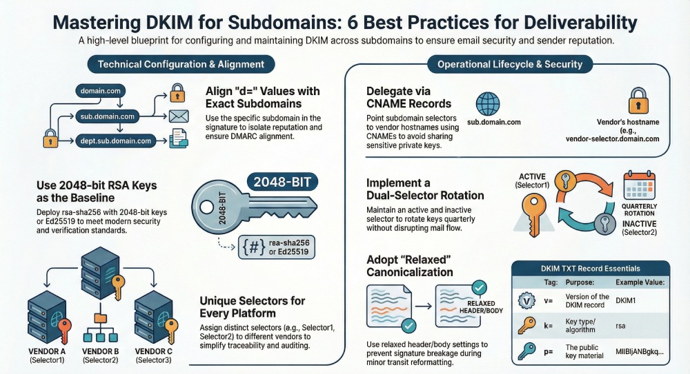 - Maintain dual selectors per subdomain, rotate keys on schedule, and remove stale DNS records to protect domain reputation.