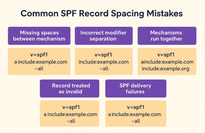 This is another common mistake that most people make while creating their record. Each mechanism and modifier in the SPF record should be separated by a single space. If you forget to add a space between mechanisms, the receiving server won’t be able to parse the record correctly, and it might treat the entire record as invalid.