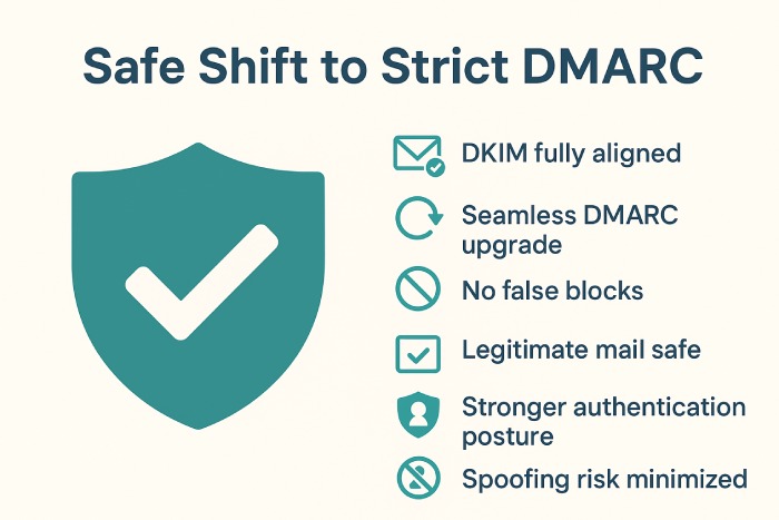 When DKIM is aligned with the “From:” domain and the signatures are valid, you can then seamlessly move on to a stricter DMARC policy, without worrying about blocking your own legitimate emails.