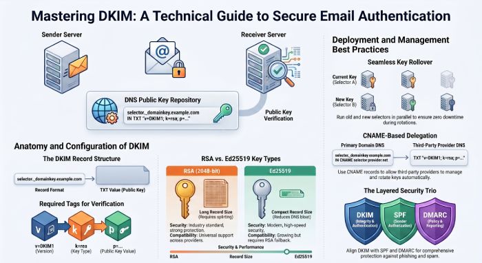 - Publish Ed25519 keys with the same selector._domainkey structure as RSA, but retain an RSA fallback until verifier support is confirmed.