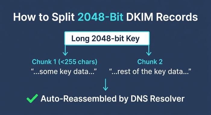 Modern guidance favors 2048-bit keys for stronger spoofing prevention. The longer p= value often exceeds 255 characters, so you split it across multiple quoted strings.