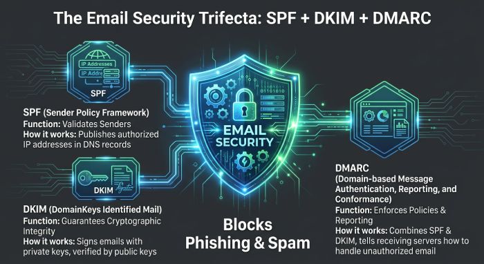 - SPF (Sender Policy Framework) authenticates the sending IP. DMARC (Domain-based Message Authentication Reporting and Conformance) aligns SPF and DKIM to strengthen spoofing prevention.