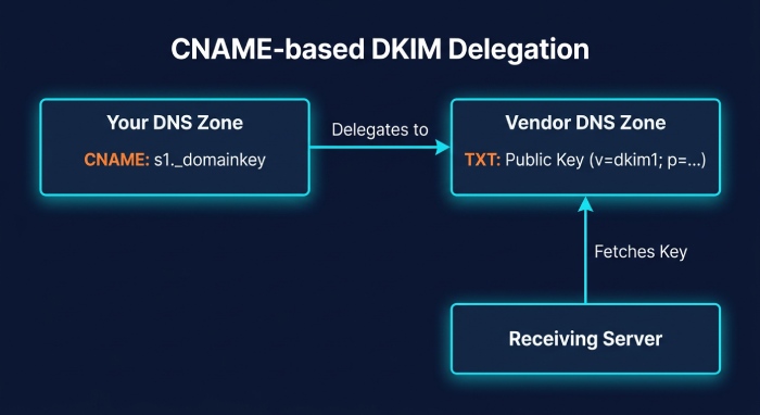 - CNAME-based delegation lets your provider rotate keys without zone edits—never mix TXT+CNAME at the same name and plan ttl for propagation.