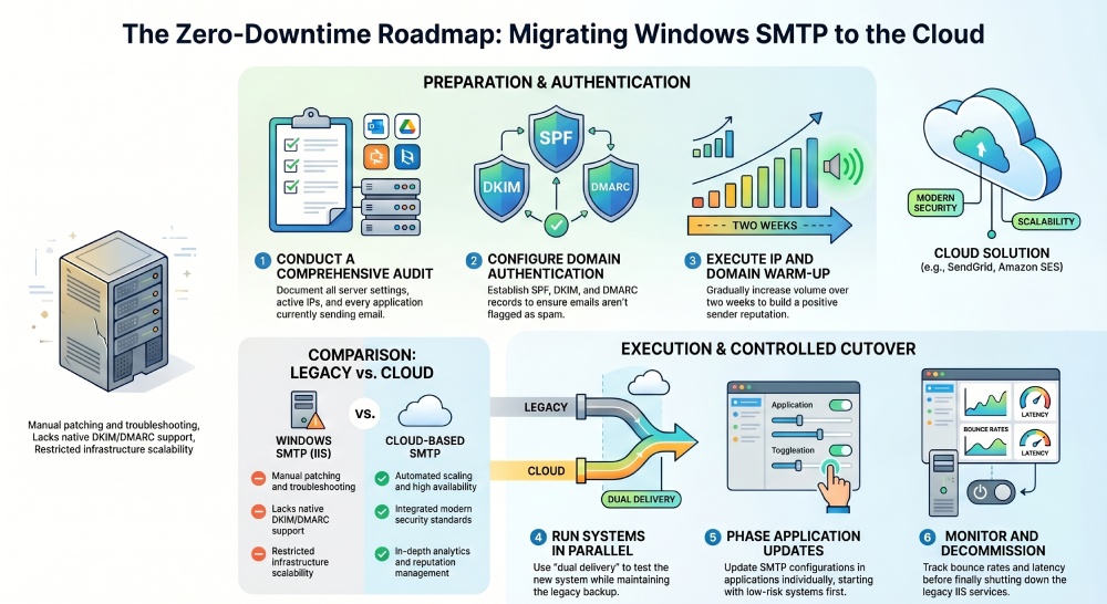 The encouraging news is that, with careful planning and a phased approach, you can successfully shift from a conventional Windows SMTP setup to a cloud-based SMTP service without any interruptions. This guide provides a clear and practical framework to help you navigate this transition with confidence and ease.