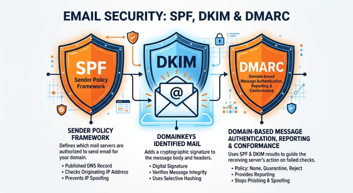 | Spam Filtering | 45% of emails globally are spam | Emphasizes importance of SPF, DKIM, and DMARC |