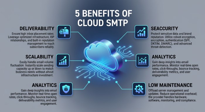 | Deliverability | Cloud SMTP services improve inbox placement by 15–25% | Better authentication and reputation management |