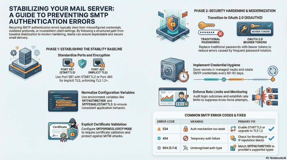 Hygiene and consistency prevent the majority of SMTP authentication error loops before they start.