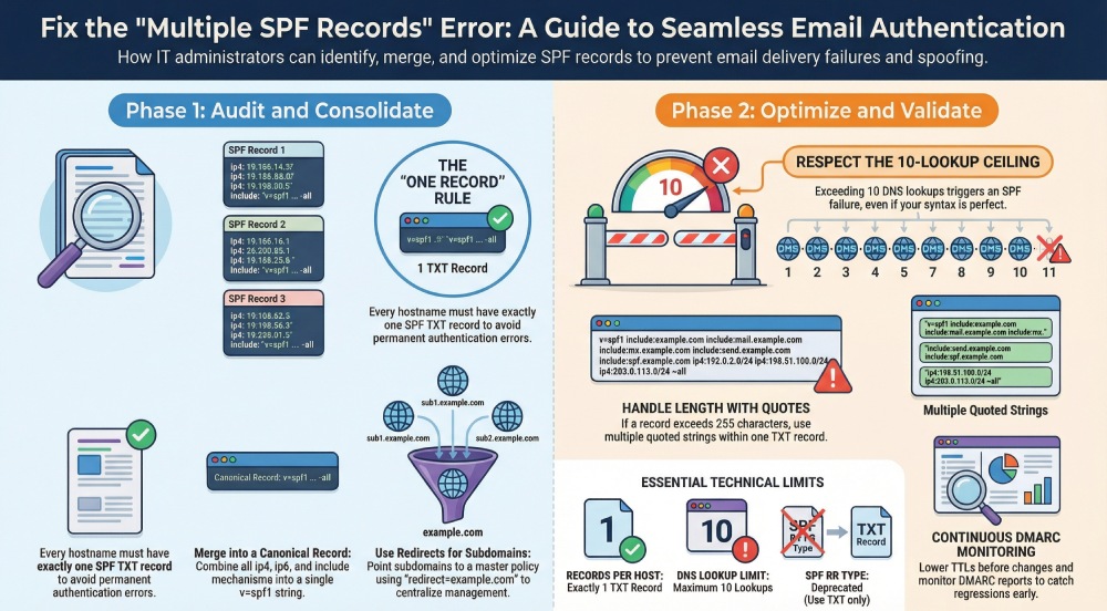 Email authentication is critical to protecting your domain from spoofing, phishing, and delivery failures but even a small DNS misconfiguration can trigger frustrating errors. One of the most common issues businesses face is the SPF multiple records error, which occurs when more than one Sender Policy Framework (SPF) record is published for a single domain. Since SPF is designed to work with only one TXT record per domain, multiple entries can cause mail servers to reject or flag your emails as suspicious.